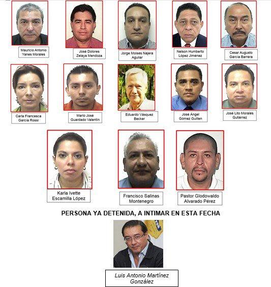 Estos son los detenidos y los delitos por los que serán acusados 1. Mauricio Antonio Yanes Morales, acusado por peculado, negociaciones ilícitas, lavado de dinero y de activos 2. José Dolores Zelaya Mendoza, por peculado en grado de participación como cómplice necesario y peculado como autor directo. 3. Jorge Moisés Nájera Aguilar, por lavado de dinero y de activos. 4. Nelson Humberto López Jiménez, por lavado de dinero y de activos y comisión por omisión. 5. Cesar Augusto García Barrera, por peculado en grado de participación como cómplice necesario 6. Carla Francesca García Rossi de Martínez, por lavado de dinero y de activos. 7. Mario José Guardado Valentín, por peculado en grado de participación como cómplice necesario. 8. Eduardo Vásquez Becker, por peculado en grado de participación como cómplice necesario. 9. Jose Ángel Gómez Guillen, por peculado en grado de participación como cómplice necesario. 10. José Lito Morales Gutiérrez, por peculado. 11. Karla Ivette Escamilla López, por peculado en grado de participación como cómplice necesario. 12. Francisco Salinas Montenegro, por peculado en grado de participación como cómplice necesario 13. Pastor Glodowaldo Alvarado Pérez, por peculado en grado de participación como cómplice necesario.